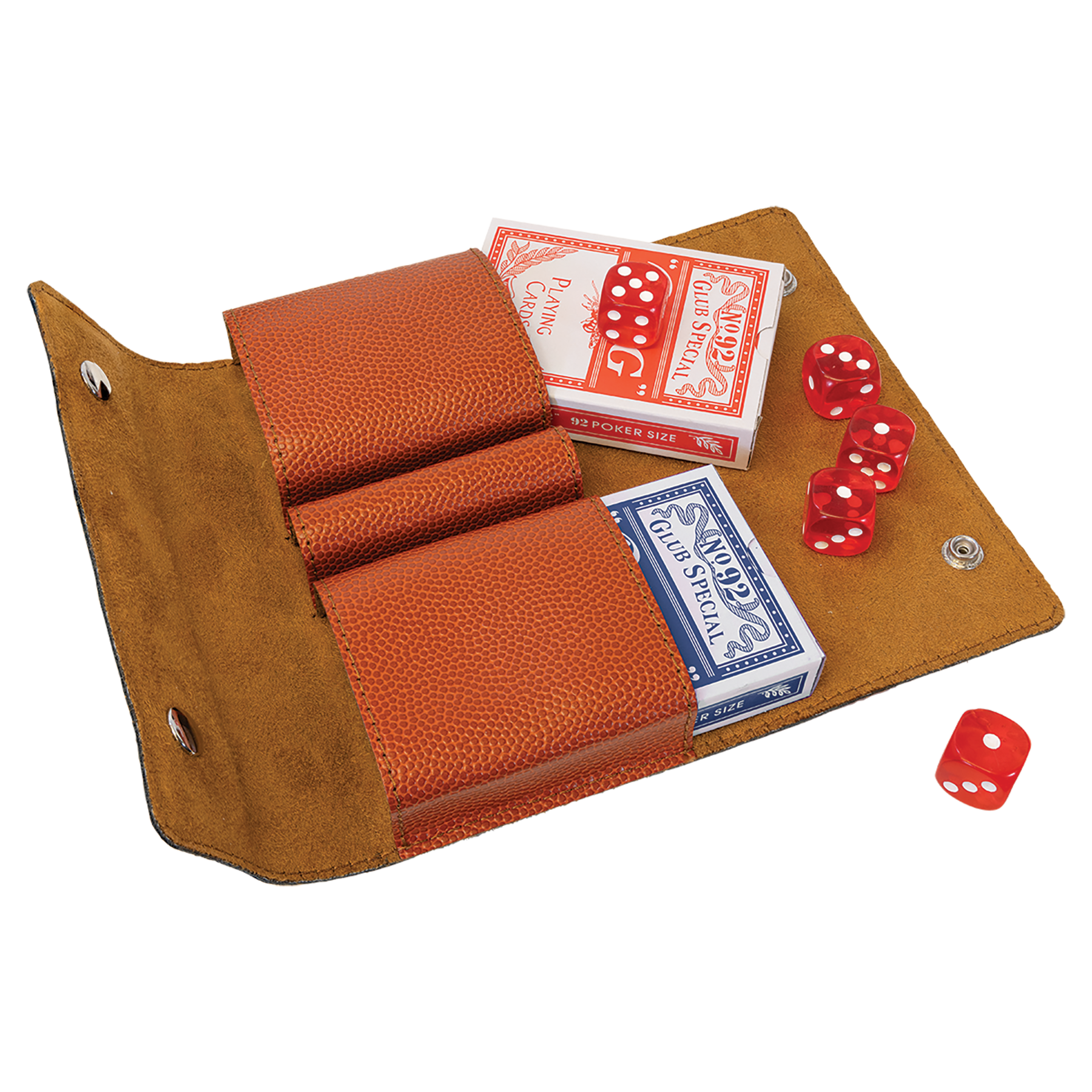 This attractive Card and Dice set is crafted from Laserable Leatherette that's designed to replicate the color and texture of a regulation basketball!The set features a double snap closure and holds two decks of cards and five dice. Available in several colors, it can be personalized by laser engraving for contrast, or UV Printed for full color using the graphics of your choice. This set makes a fun incentive, promotional item, or gift.