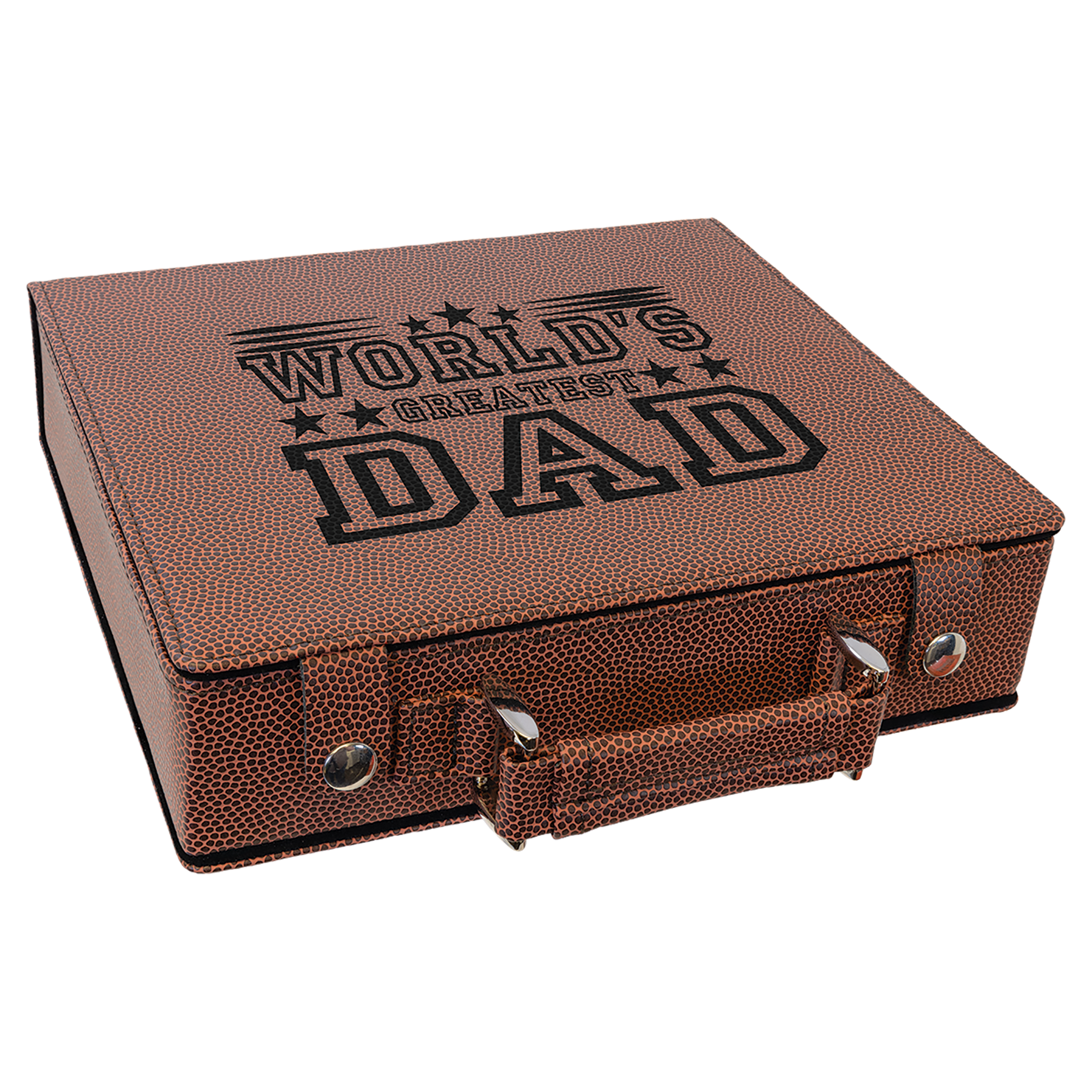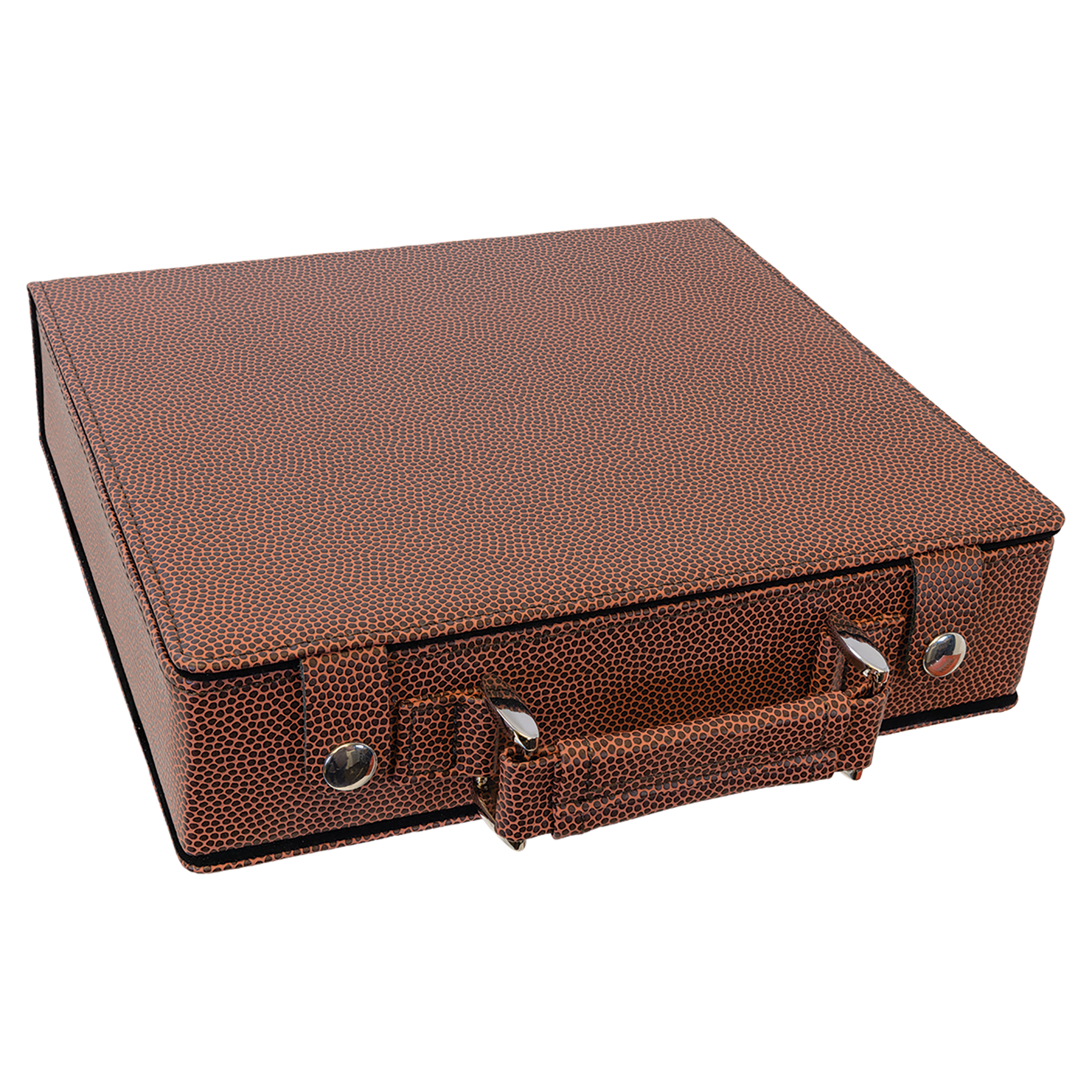 This poker gift set contains 100 commercial grade chips, 2 decks of cards, and 5 dice. The box itself is crafted of Laserable Leatherette designed to replicate the look and feel of a regulation football! The set features a black felt lining, carry handle, and snap closures to keep contents secure. Personalize with a logo, monogram, or other graphics to create a unique incentive, promotional item, or gift.