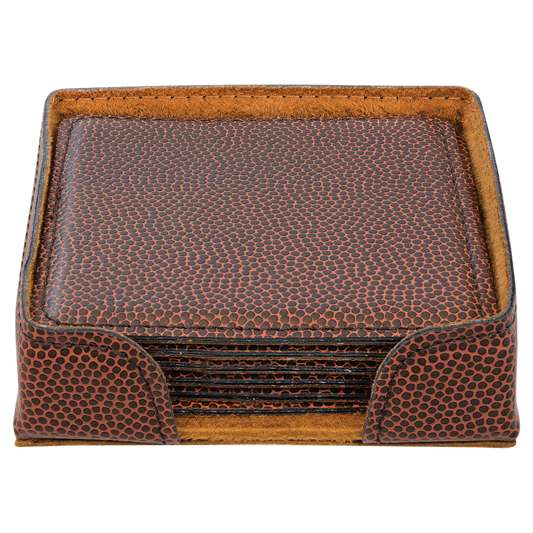 This set of 6 square coasters with holder are made of Laserable Leatherette, richly textured, and designed to replicate a regulation football. They're water resistant and durable enough to withstand the rigors of daily use. The quality workmanship of each leatherette piece is sure to impress. Great as gifts or promotional items, the coasters and holder can be personalized through engraving for a sharp contrast. It also works great for UV printing!