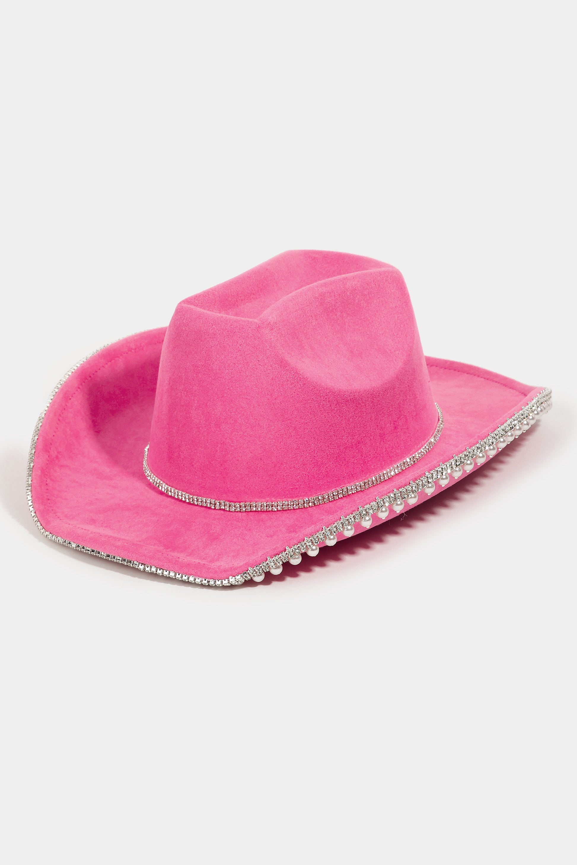 Yeehaw! This Rhinestone Cowboy Hat is the perfect accessory for the bride's big day. Featuring a leather patch of his handsome face, this hat is decked out in sparkling rhinestones and pearls. She'll be the most stylish cowgirkin town! Giddy up!